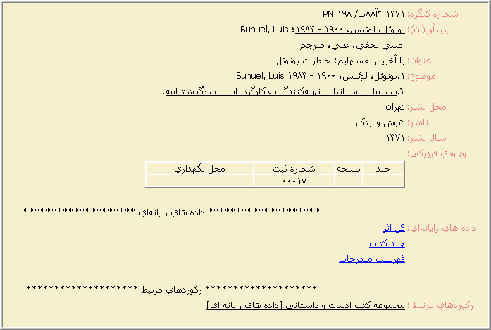 در فرم تخصصی صفحه نمایش کامل سه نوع لینک برای جستجو و نمایش اطلاعات تکمیلی وجود دارد: 1) لینک (Hyperlink )برای جستجوی اطلاعات کتابشناختی اگر به مثال بالا دقت کنيد، متوجه مي شويد که زير عبارتهاي مربوط به "پديدآور"، "عنوان" و "موضوع" خط کشيده شده است. اين سه مورد از اطلاعات کتابشناختي به شکل Hyperlink بوده و لذا مي توانيد با کليک روي هر کدام از آنها عبارت فوق را جستجو کنيد. براي مثال فرض کنيد در نمايش کامل يک رکورد، عبارت "پديدآور: ابتهاج، هوشنگ" نشان داده شده است. حال اگر روي عبارت "ابتهاج، هوشنگ" کليک کنيد سيستم به جستجوي کتابهاي هوشنگ ابتهاج پرداخته و در صورت وجود نمايش خواهد داد. وجود لينک ها امکان جستجوي سريع را براي کاربر فراهم مي کند و او را قادر مي کند به صورت متداخل و تودرتو به جستجوي خود ادامه دهد. 2) لینک (Hyperlink) برای نمایش داده های رایانه ای اگر رکورد در حال نمایش شامل فایلهای رایانه ای (تمام متن، صدا، تصویر، ...) باشد آنگاه برای نمایش این فایلها لینکهایی را خواهيد ديد. براي مثال در فرم نمايش کامل بالا که مربوط به یک کتاب می باشد لینکهای زیر دیده می شود: