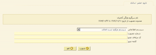 همانطور که مي بينيد در اين پنجره نام سرگروه و محدوديت عضويت گروه نشان داده شده است و نشاندهنده اين است که اين محاوره مخصوص اتصال اعضاي زيرگروه مي باشد. در اين پنجره، بايد نام و کلمه عبور اختصاصي خود را مجددا" وارد کنيد و سپس تکمه "تصويب" را فشار دهيد تا به سيستم امانت متصل شويد. |