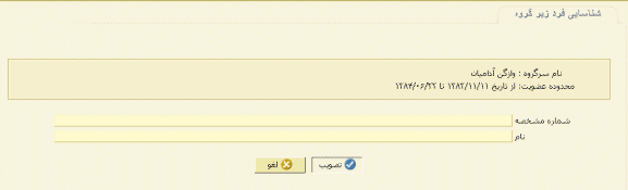 در اين پنجره نيز مشخصات سرگروه و محدوده عضويت گروه مشخص شده و همانظور که از نام پنجره نيز پيداست، تنها براي شناسايي نام و شماره مشخصه عضو مي باشد. به عبارت ديگر اين پنجره براي تاييد هويت عضو نيست بلکه براي اين است که مسئول ميز امانات، عضو را بشناسد و بداند که به چه کسي بايد سند يا کتاب را امانت بدهد. |