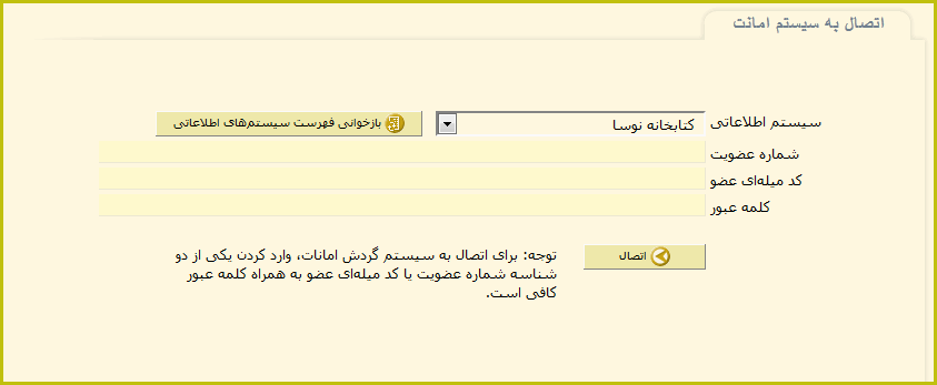 براي استفاده از سرويسهاي امانت، ابتدا بايد به سرور امانت متصل شويد. توضيح اين که سيستم امانت يک سيستم چندلايه (n-tier) است که يکي از لايه هاي آن لايه سرور امانت مي باشد. هر کاربري که بخواهد از سرويسهاي امانت استفاده کند بايد به شکل يک کلاينت به سرور امانت متصل شود. به همين دليل به محض باز کردن منوي "سرويسهاي امانت"، پنجره "اتصال به سیستم امانت" (شکل زیر) باز شده و سیستم به طور خودکار به اولین سرور معرفی شده امانات متصل می شود. پس از برقراری اتصال و نمایش نام سیستم اطلاعاتی مورد نظر، باید با یک شماره عضویت یا کدمیله ای معتبر و کلمه عبور مختص به آن ، به سیستم امانت متصل شوید: دريچه ها و کليدهاي موجود در اين صفحه به شرح زير مي باشد: