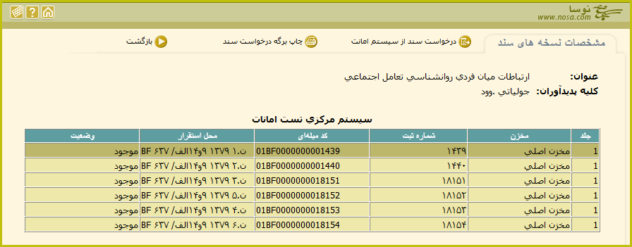 در اين پنجره همانطور که مي بينيد، تقريبا" تمام اطلاعات مورد نياز براي امانت يک سند موجود مي باشد. علاوه بر عنوان و پديدآوان سند، جدولي را مشاهده مي کنيد که مشخصاتي از قبيل شماره ثبت، کدميله اي، محل استقرار و وضعيت امانت را به تفکيک نسخه و جلدهاي سند نشان مي دهد. ستون "وضعيت" نشان مي دهد که يک نسخه خاص، آيا در مخزن موجود است يا اينکه به امانت رفته است. در ادامه، فرايند درخواست سند از سيستم امانت و مراحل آن شرح داده شده است: |