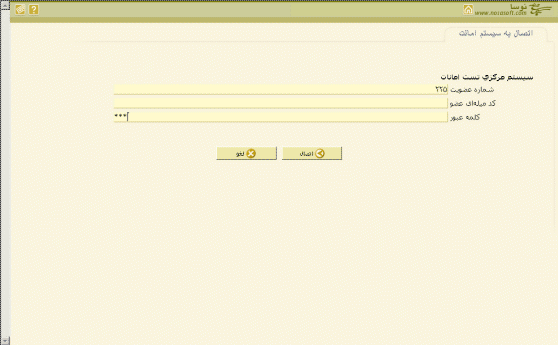 برای درخواست سند، کافی است پس از انتخاب نسخه مورد نظر، نشانگر را روی نسخه یادشده ببرید و تکمه "درخواست سند از سیستم امانات" را فشار دهید. از آنجایی که درخواستهای امانت در سیستم امانت انجام می شود، در این مرحله اگر قبلا به سیستم امانت متصل نشده باشید، پنجره اتصال به سیستم امانت به شکل زیر باز می شود: |